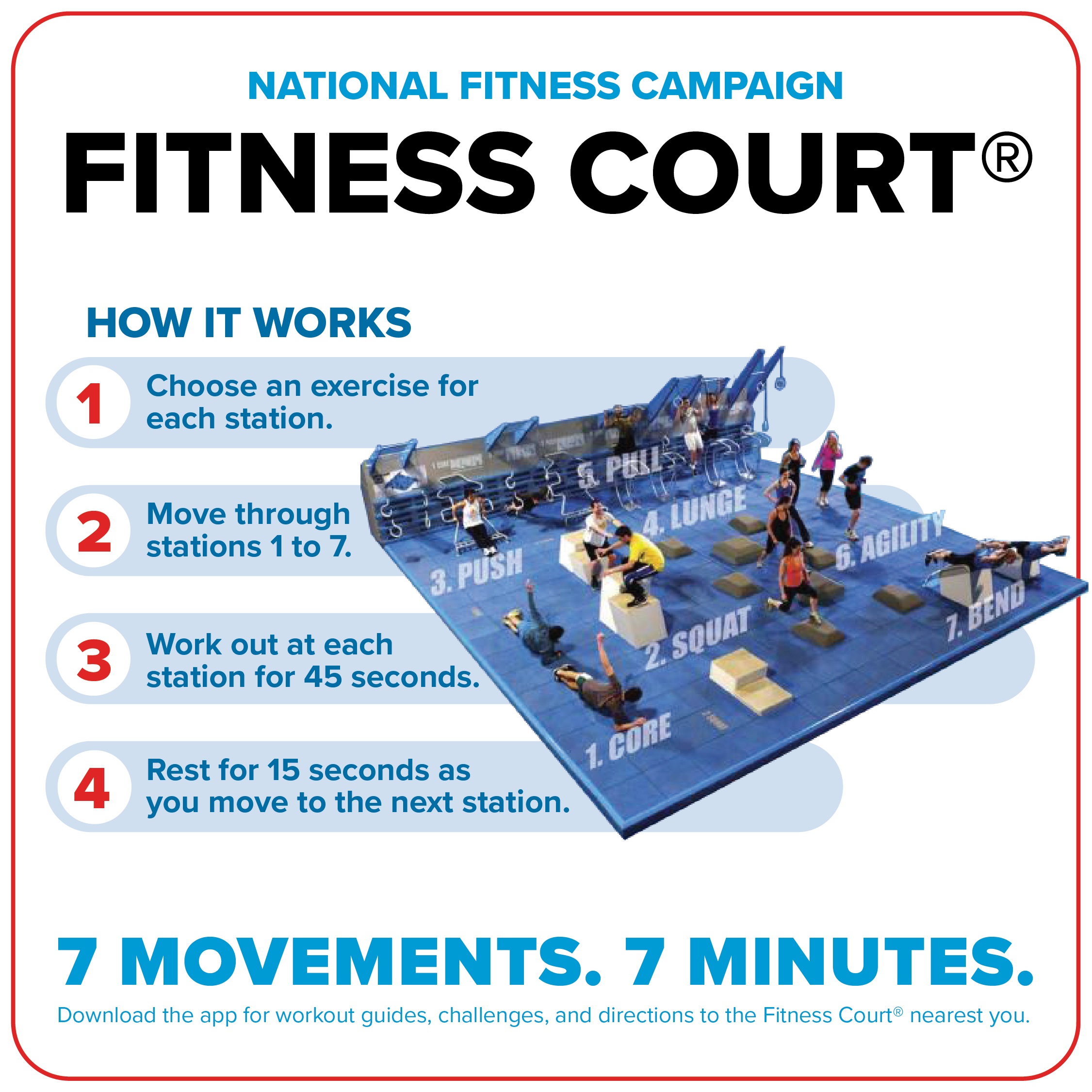 The Fitness Courts provide access to free outdoor exercise equipment for anyone over the age of 14 at any fitness level, allowing people to use their own body weight to get a complete workout using seven exercise stations in as little as seven minutes.