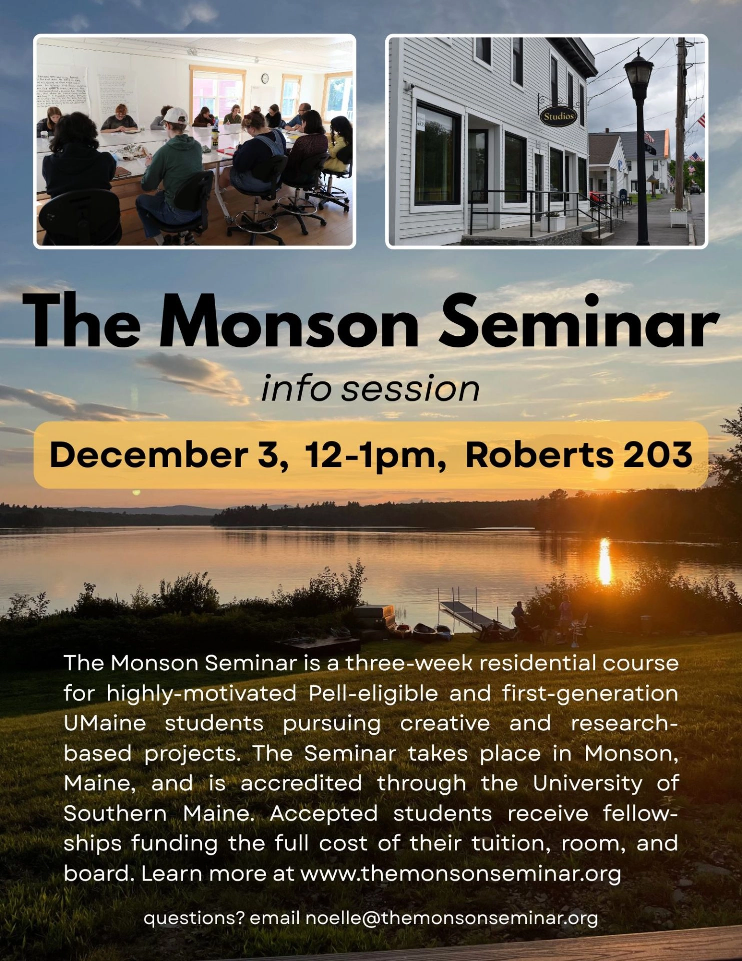 The Monson Seminar will be holding an info session on Wednesday, Dec. 3, from 12-1pm in Roberts 203. It is a three-week residential course for highly motivated Pell-eligible and first-generation college students pursuing creative and scholarly projects. The seminar takes place in August in Monson, ME, and is accredited through the University of Southern Maine. […]